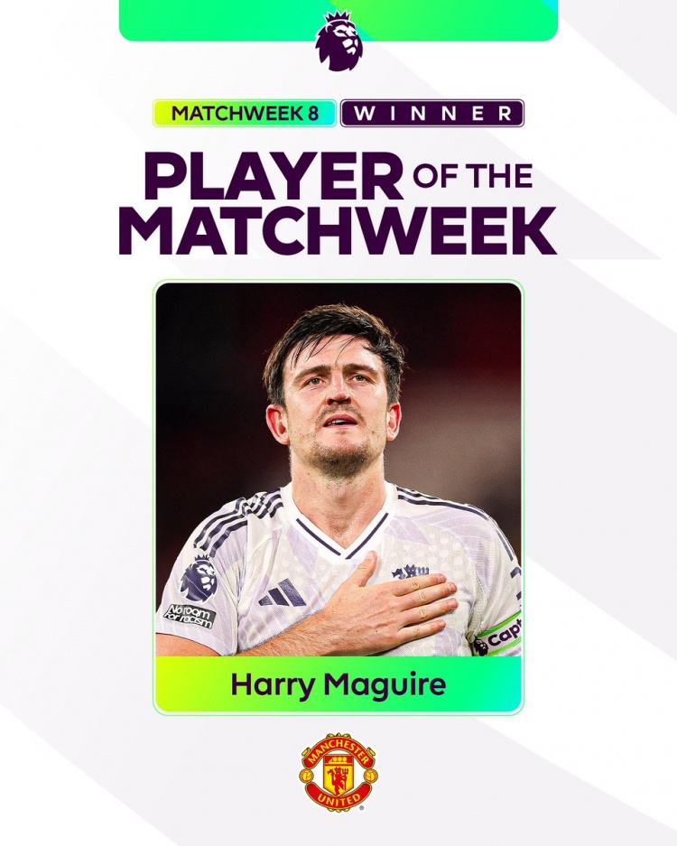 10月22日讯 英超官方宣布,马奎尔当选英超第8轮最佳球员。